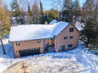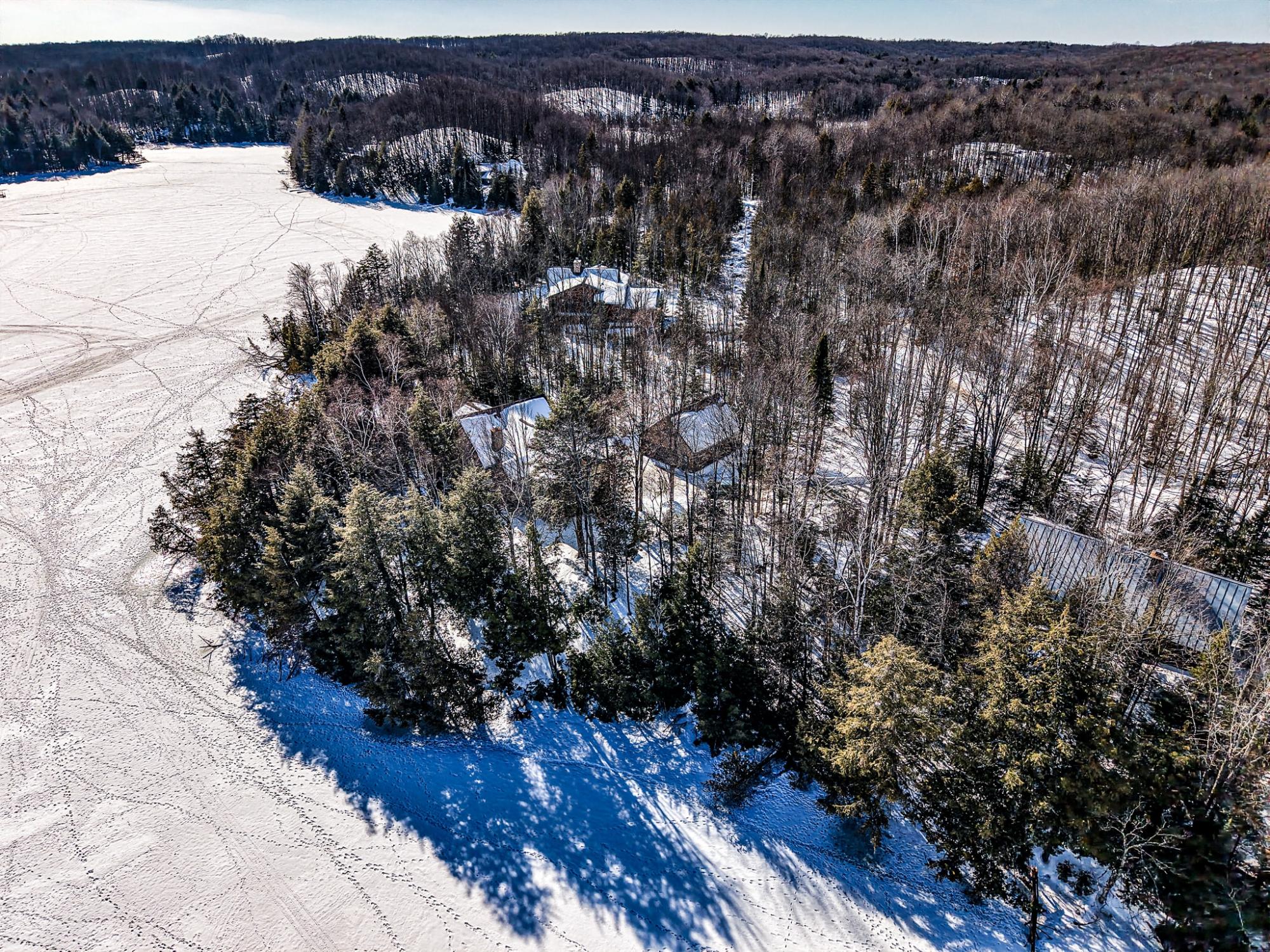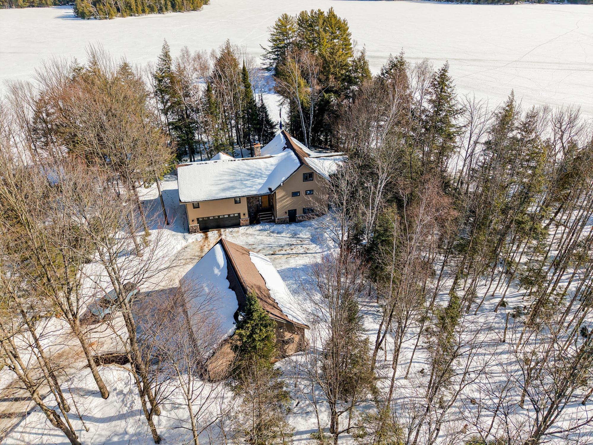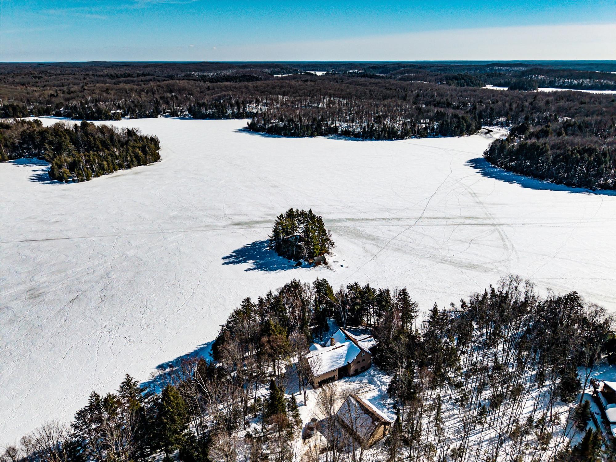 Located on a no public access Armour Lake, this well-maintained custom executive home is at the end of a coveted point with 371' of panoramic frontage, creating a rare “water on three sides” feel with water views in all major rooms. Offering 4 bedrooms and 3 full baths, the layout features a huge primary suite with walk-in closet and private bath, two additional bedrooms on the main level, plus a loft bedroom upstairs. Enjoy summer nights in the screened porch, then gather around the massive full-masonry stone fireplace in the great room. The spacious walkout LL adds a family room and wet bar with direct garage access. A 24x24 attached 2-car garage is joined by a 32x28 detached, heated garage with a 1-bedroom apartment above—ideal for guests or family. East-facing for unforgettable sunrises over clear, shimmering Armour Lake where your grandkids will come just for the unforgettable swimming beach. A true Northwoods showpiece!