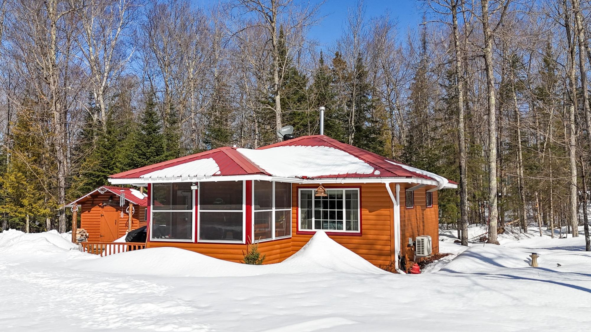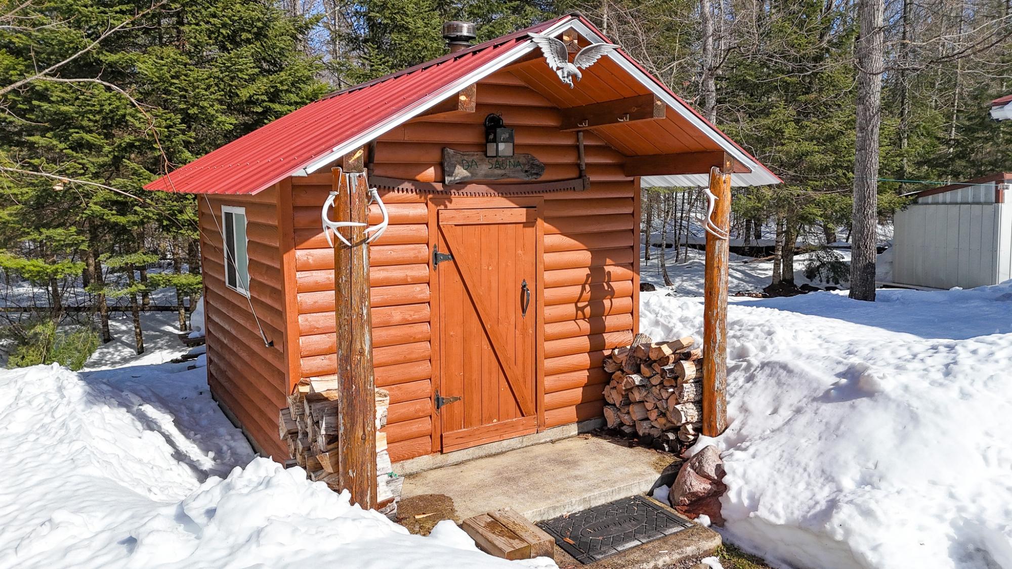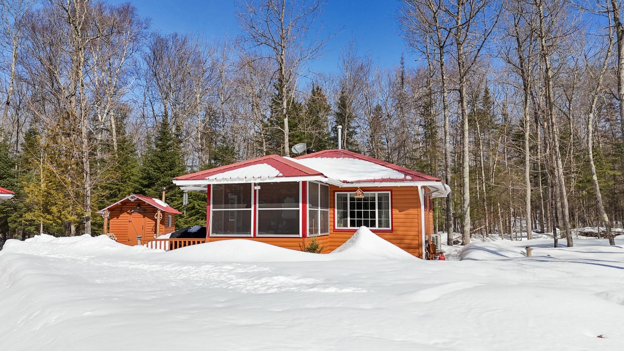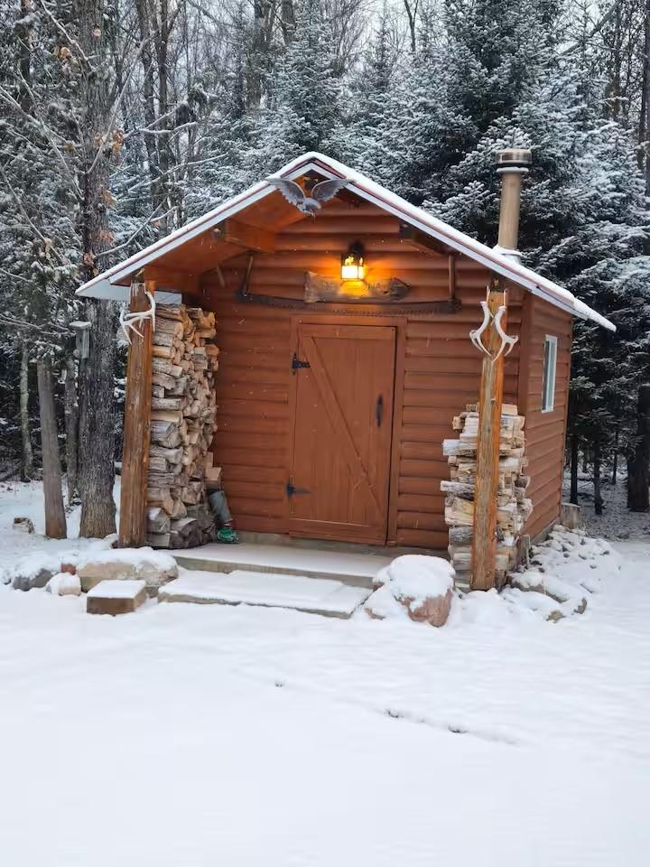 Private Northwoods getaway in highly sought-after Winchester! This furnished move-in ready 4-season cabin features a charming half-log exterior and warm knotty pine walls and ceilings that create the perfect Up North feel. The cabin offers 2 bedrooms and 1 bath and has been very well maintained. A detached 2-car half-log garage is insulated and heated and includes a bonus bedroom—ideal for guests, extra sleeping space or a hobby area. Enjoy the separate half-log wood-burning sauna after a day on the trails. Currently operating as a successful Airbnb rental, this property offers excellent income potential or the opportunity to enjoy as your own year-round home or vacation retreat. Located near skiing, biking and snowmobile trails, making it a perfect basecamp for Northwoods recreation. Home can easily be lifted to add a full basement. 2500 gal Holding tank is already set up to add a mound system.
