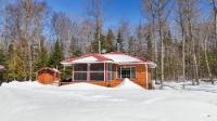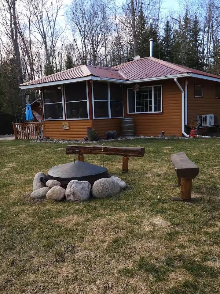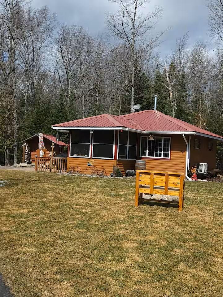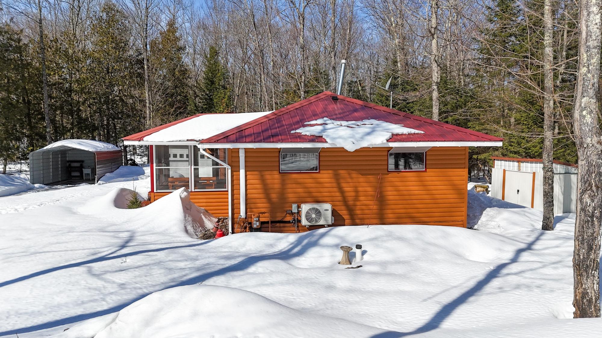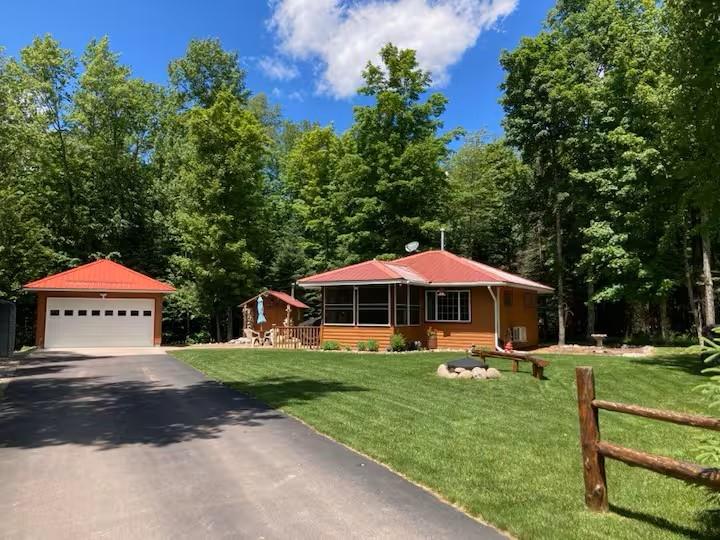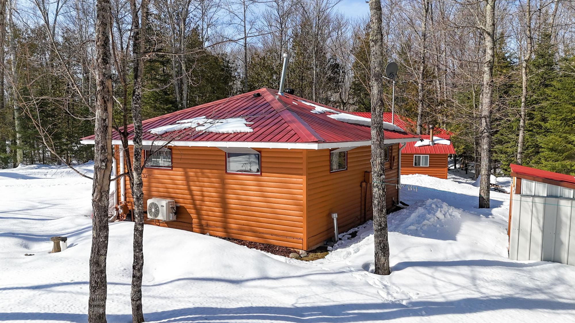 Private Northwoods getaway in highly sought-after Winchester! This furnished move-in ready 4-season cabin features a charming half-log exterior and warm knotty pine walls and ceilings that create the perfect Up North feel. The cabin offers 2 bedrooms and 1 bath and has been very well maintained. A detached 2-car half-log garage is insulated and heated and includes a bonus bedroom—ideal for guests, extra sleeping space or a hobby area. Enjoy the separate half-log wood-burning sauna after a day on the trails. Currently operating as a successful Airbnb rental, this property offers excellent income potential or the opportunity to enjoy as your own year-round home or vacation retreat. Located near skiing, biking and snowmobile trails, making it a perfect basecamp for Northwoods recreation. Home can easily be lifted to add a full basement. 2500 gal Holding tank is already set up to add a mound system.